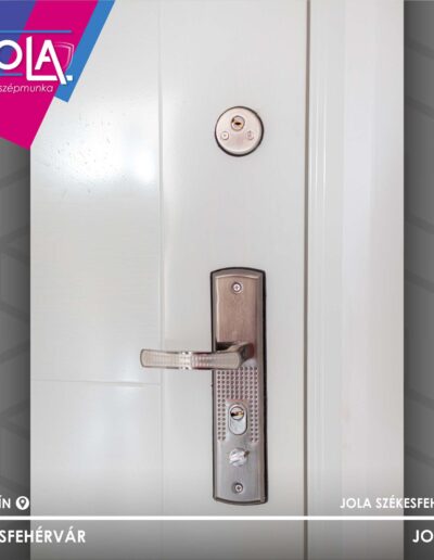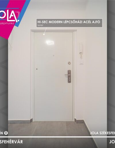 A bejárati ajtó is tőlünk van, egy klasszikus és hazánkban nagyon népszerű HiSec típust vittünk, annak „Modern” típusát, fehér színben.